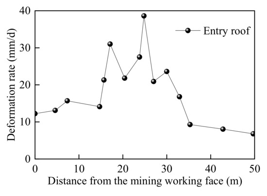 Mining-induced failure criteria can be used to effectively analyze the mechanical behavior of IHRS and determine the limitation value of the additional abutment stress. The results are helpful to protect the underground openings nearby IHRS from large deformation, such as roof sinking, floor heave, rib displacement, support failure, and even roof caving of the openings in 30 m away from the mining working face in Yangquan coal mine (Figure 12). The peak value of the deformation rate of the entry roof nearby IHRS is located between 20 m and 30 m from the mining working face. This curve shows an upward and downward trend, rather than a steady trend (Figure 13). The technologies of hydraulic fracturing to weaken hard roofs in advance have been gradually accepted in coal mines of China recently [54,55,56].