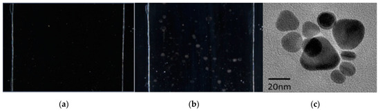 - The resulting solution was then rinsed by putting it in a centrifuge for 3 h at 10,000 rpm, and then redispersed into deionized water. This step of the process removes excess reagents and rounds the triangular particles into silver nanodiscs (which have a superior selective transmission for this application). The resulting nanodiscs had a particle diameter of 20–50 nm, as was indicated in Transmission Electron Microscopy (TEM) measurements (as shown in Figure 3c) [29].