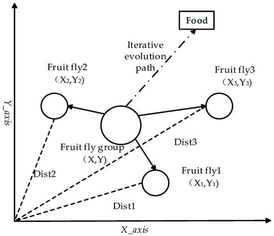 The FOA is a new optimization approach that simulates the foraging behaviors of a fruit fly swarm [,]. Their sensitive smell and sharp vision contribute to the discovery of food sources over 40 km and correct flight to the location [,]. The food searching procedure of a fruit fly swarm can be seen from Figure 1.