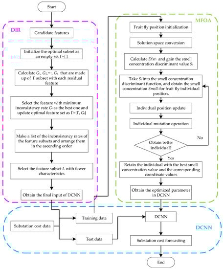 The framework of the established technique MFOA–DIR–DCNN for substation project cost prediction is displayed in Figure 3. The specific procedures of this novel method can be explained at length as follows: