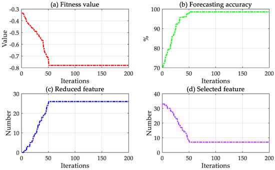- Derive the optimal feature subset along with the best values of parameters in the DCNN. The feature subset at current iteration is brought into the DCNN, and both prediction accuracy and fitness value can be calculated for this training process. Then, determine whether each iteration satisfies the termination requirements (reach the target error value or the maximum number of iterations). If not, reinitialize the feature subset and repeat the above steps until the conditions are met. It is noteworthy that the parameters in the DCNN also need to be optimized, and the initial values of weight and threshold are randomly assigned. Therefore, a fitness function based on both forecasting precision and feature selection quantity is set up, as shown in Equation (36):where represents the quantity of selected best characteristics in each iteration, and and equal the constants in [0, 1].