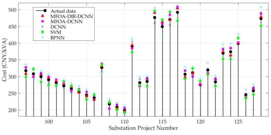 - Forecast via the DCNN. When the iterative number reaches the maximum, the estimation stops. Here, the optimal feature subset, the best values of , and are taken into the DCNN model for substation project cost forecasting.