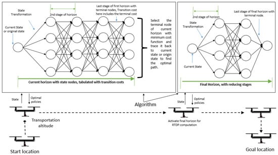 During the start of the journey, the DP sweep with terminal costs is performed as follows. The transition costs are calculated for all stages of current horizon only. Starting with the origin or taking the current state of the agent, the transition costs of all possible states will be calculated and stored for the first stage. Now, for the second stage, at each node, the cumulative transition costs of reaching this node from all states of the first stage will be calculated. This process will be repeated from to until the terminal node. After reaching the terminal node of the current horizon, the transition cost to the terminal node will include the terminal cost as shown in Figure 1 and explained in Equation (1). Starting from the terminal node with minimum cost, the optimal solution will be traced back to node . After obtaining the optimal policies, control actions will be immediately utilized until the agent reaches the next stage. When the agent reaches the next stage, we will take the current state of the agent and consider it as the origin and run the algorithm again until the end of the rolling horizon. After reaching the terminal node of the current horizon, we will again trace back the solution and immediately implement the optimal policies. The process will be repeated until the vehicle enters the last horizon.