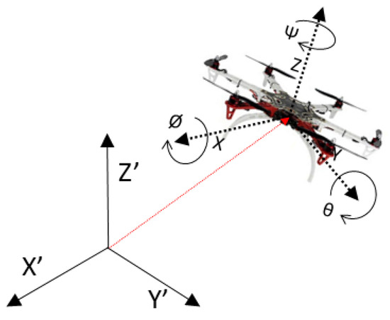 The system consists of a hex-rotor as shown in Figure 2. The UAV model was simplified by assuming that the UAV structure is rigid and CoG (center of gravity) and geometric centre is at origin B of the body frame and coincide. Let be the position vector of the center of mass of the hex-rotor relative to the fixed inertial frame . The orientation of the hex-rotor is expressed in Euler angles as , where is the roll angle about the x-axis, is the pitch angle about the y-axis, and is the yaw angle about the z-axis of the hex-rotor UAV. Six rotors attached to identical brush-less DC motors are rotating with a speed . The following equations best describe the translational and rotational dynamics model used in this paper for the hex-rotor UAVs [22]: