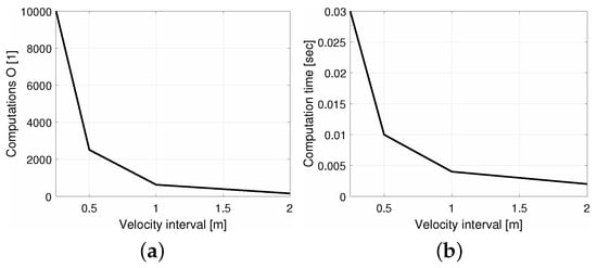 The effects of a decrease in velocity interval that results in an exponential increase in (a) number of computations O and (b) computation time.
