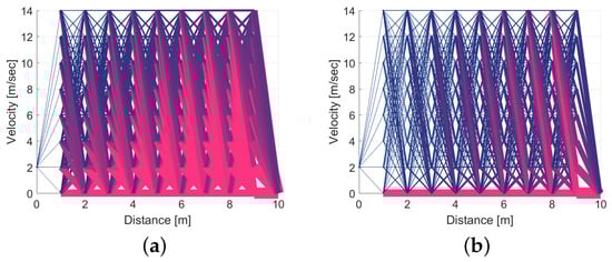 A Dynamic programming (DP) sweep with velocity interval 2 m/s and horizon length 10 m, initial velocity 2 m/s and final velocity 0 m/s. Width of the lines and intensity in redness shows a high value of combined cost function (a) ; (b) .
