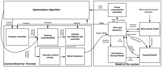 Description of the complete system for simulation tests of the algorithm, including the controller block, the hex-rotor block, and the optimization algorithm block.