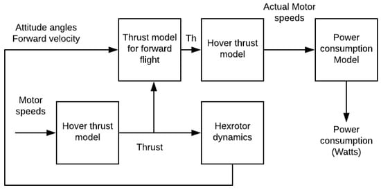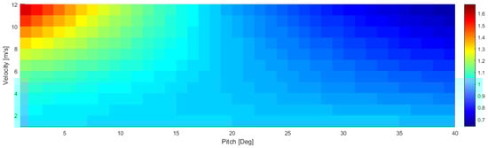 The thrust is generally modeled as , which is called the thrust model at hover. This model, however, does not accurately predict the thrust and motor speed relation during high speed forward flights as it is observed in [26,27]. It was also concluded in [28] that, for the same rotor speed, the thrust decreases greatly at higher angles of attack and higher speeds. Another experimental study by [29] showed that the total lift produced by various multi-rotors decreases by decreasing pitch angles from to when subject to 6 m/s wind speed. In another study [30], a controller is proposed to be able to compensate for thrust irregularity during forward flights. This thrust deficit in high speed forward flight means that the propellers have to rotate faster than usual to produce the thrust required. This simply means that more energy is consumed during forward flight to maintain the same thrust. In [30], this thrust irregularity is modeled using Equations (28)–(30).