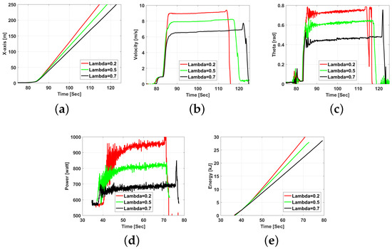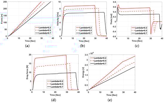 Flight plots for numerical simulations performed for . (a) trajectory of the UAV; (b) velocity of the UAV; (c) pitch angle of the UAV; (d) opposing drag force of the UAV; (e) energy consumption of the UAV.