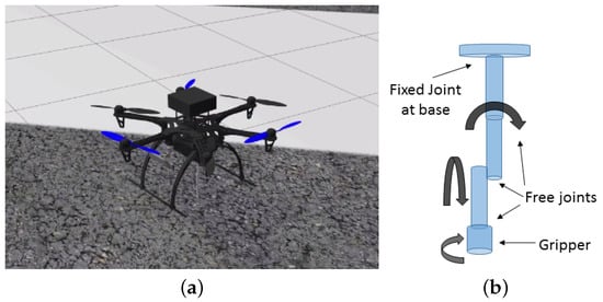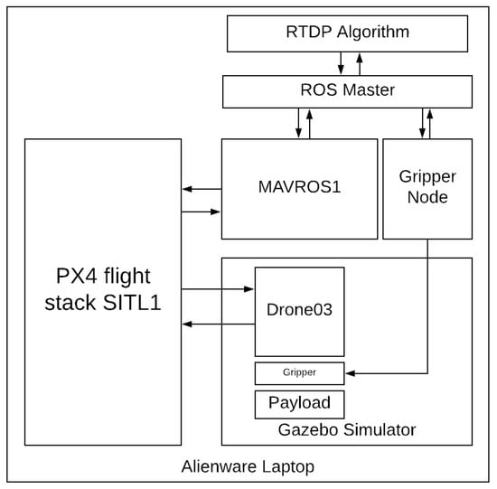 Using the Table 1, the DJI F-550 drone was modeled in Gazebo as shown in Figure 10, and the same PX4 flight stack was simulated as it is used in the real autopilot. The ROS, MAVROS package, PX4 flight stack simulator, Gazebo simulator and the RTDP algorithm were running on the same Linux computer. The computer has a 2.4 GHz processor and 32 GB RAM. All communication between MAVROS, Gazebo and gripper node were performed via the local ROS MASTER.