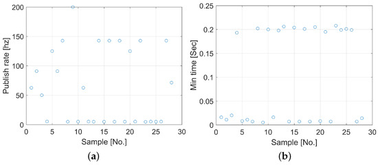 Publish rates and time as obtained by the ROSTOPIC tool with a sample of two consecutive messages. (a) publish rate of the velocity command topic; (b) minimum and maximum time between two commands.