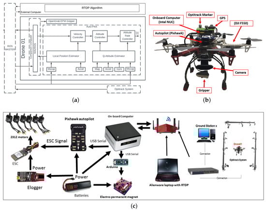 A description of the hardware used in the testing of the RTDP algorithm. (a) software architecture of experimental setup; (b) DJI-F550 drone used in the experiments; (c) power source and route for various components of the drone.