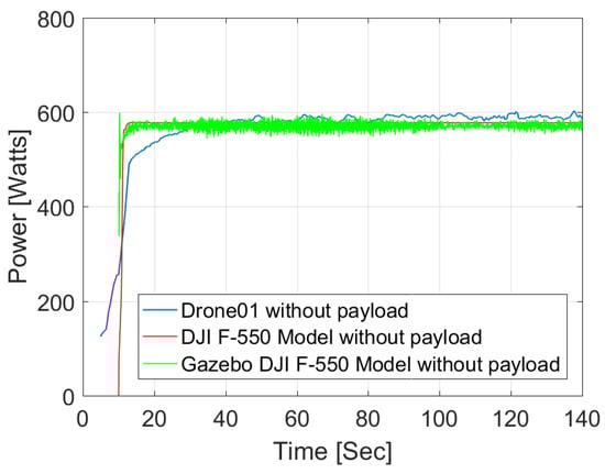 An initial baseline experiment was performed, where the Drone01 was kept in hover at fixed altitude set-point. There was no payload attached to the Drone01. The drone01 is the same drone that was modeled in SITL and Simulink simulations. The power consumption was recorded and compared with the SITL and Simulink model hover power consumption. The results are plotted in Figure 14. It can be seen in Figure 14 that power consumption in SITL and Simulink models at hovering condition matches with the hardware experiments. However, there are minor discrepancies during the takeoff, which can be ignored for this study since the optimization is performed for transportation from point A to point B.