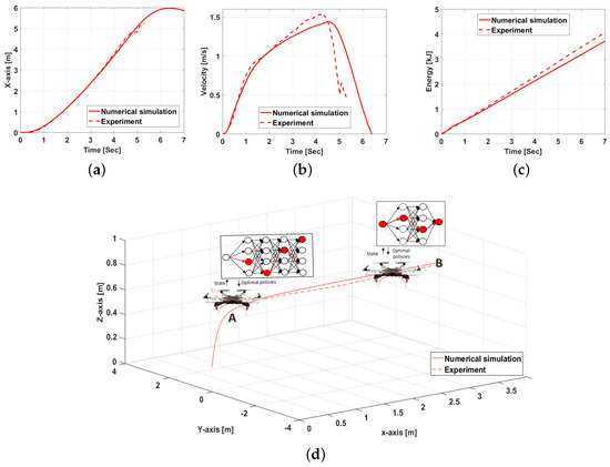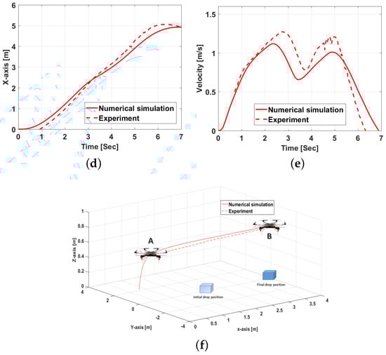 An experiment was performed to test the feasibility of transportation from point A to point B using RTDP experiments. A distance interval of 0.1 m was considered, with 10 distance intervals in one horizon. The starting point was , whereas the goal position was . A velocity interval of 0.1 m/s was considered with a velocity range of 0–12 m/s. The time-energy weight-age factor of was chosen. The drone01 took off manually while it was transported to point A. At point A, the RTDP algorithm was triggered and, when the drone reached point B, the RTDP algorithm was switched off and drone was manually landed. The trajectory of the transportation and the velocity profiles of the numerical simulation and the experiments are plotted in Figure 15.