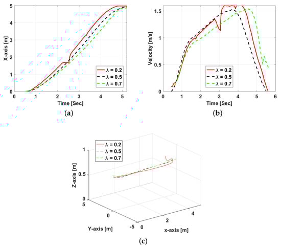 After comparing the simulation and experiments for , two more experiments were performed to compare with . The horizon length, distance interval, start point and goal point were kept the same and fixed. The results of the experiments are plotted in Figure 16 showing the comparison of velocity profiles and trajectories between . As expected, the drone01 reaches the destination in the order , which is also reflected in the velocity profiles. This test was performed in the lab environment where, due to space constraints and safety limitations, high speed flights were not achieved. However, these tests confirmed that the algorithm is capable of transporting the drone01 from point A to point B successfully, while manipulating the journey time. Minimization of journey time is useful in energy savings when the opposing drag forces are not significant, which is the case in these lab experiments.