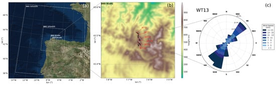 (a) WRF nested grid configuration, with the number of points for each domain indicated. (b) D04 is expanded showing its topography. Coruxeiras wind farm is located in the central area of D04, on top of a hill. Observational data for the study is obtained from meteorological stations at the hub of the wind turbines plotted in red. (c) Annual wind rose from observational data at hub height from a wind turbine in the center of the farm (WT13).