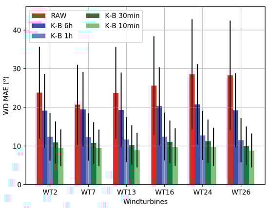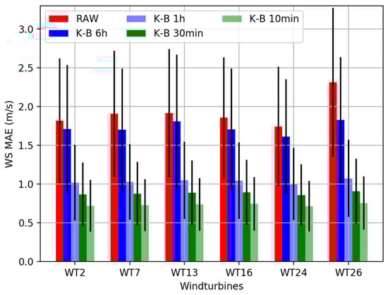 Overall, a similar improvement concerning WS MAE for all the wind turbines and cases is recorded. Raw WRF forecast MAEs are between 1.91 and 1.74 m/s, except for WT26, which has a RAW MAE of 2.31 m/s. All of these results, regardless of wind farm area, present a small reduction of the WS MAE (of around 10%) in the longest nowcast period, K-B 6 h (blue). It is important to highlight that the specific K-B approach employed in this experience is the result of training the tool for the nowcast time horizons analyzed. For this reason, apply this K-B tool configuration for a longer range, as for example K-B 24 h, would generate even worse than RAW case (K-B 24 h WS MAE = 2.37 m/s). Longer forecasting time ranges, as 24 h, are associated with different temporal-spatial scale wind phenomena and the sources of the errors for this temporal resolution are also different. If we want to use this K-B tool for 24 h or a longer horizon, it is necessary to perform a different training of the K-B for the points of interest. Continuing with Figure 2’s discussion, the accuracy of the K-B filter is significantly enhanced for shorter lead times, with K-B 1 h (pale blue) reaching a WS MAE of around 1 m/s in all cases. The shorter nowcasting periods, K-B 30 m (green) and K-B 10 m (pale green) show a further reduction of error, with values around 0.86 and 0.72 m/s respectively. The standard deviations plotted on top of each bar () are also reduced for all turbines, in parallel with the shortening of the nowcasting periods. RAW cases have a mean of 0.82 m/s, and K-B 10 min present a mean value for all of the machines of 0.33 m/s.