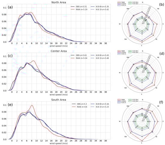 (a) Wind speed distribution plot for observations, RAW, K-B 6 h and K-B 1 h time experiments in the north area of the wind farm. The standard deviation of each distribution is indicated in the legend. (b) Radar charts comparing WS errors by observed wind direction in the north area. (c) Same as (a) for the center area. (d) Same as (b) for the center area. (e) Same as (a) for the south area. (f) Same as (b) for the southern area.
