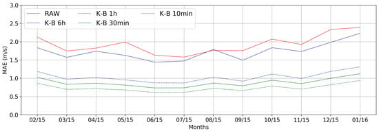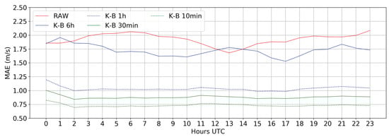 RAW error results present a daily cycle, with values of the MAE around noon lower than during the night. These differences among the hourly WS MAEs are, however, not very significant, and the lower absolute errors at noon seem to be related with the better representation of turbulent fluxes during that part of the day []. In contrast, K-B 6 h errors do not follow a daily cycle, attaining values below 1.75 m/s mostly during daytime, but obtaining a worse result than RAW at 01 and 13 UTC. K-B 1 h, 30 min, and 10 min present a very flat error pattern all day long. There are practically no differences among hourly results in these experiments. The situation is very similar to that in the monthly error plot (Figure 4); shorter term K-B cases represent a significant improvement with respect to K-B 6 h and RAW, and there is homogeneity in the entire error series in K-B 1 h, 30 min, and 10 min. The skill limit for the shorter term cases corresponds to a non-systematic part of the error, which is unavoidable for the filter.