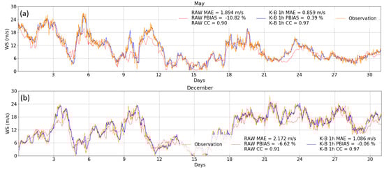 (a) Wind speed at hub height in the center area with observations (orange), RAW (dotted red), and K-B 1 h (blue) in May. (b) Same as (a) in December. Wind speed MAE, PBIAS and Correlation Coefficient (CC) for each series is presented in the legend for both figures.