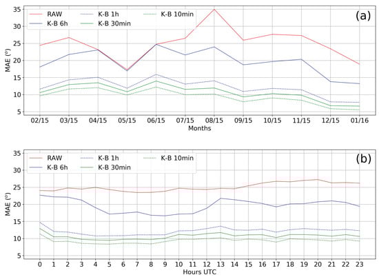 Changing the timescale of the analysis, Figure 8b shows the evolution of the WD MAE throughout the day. The RAW series (red line) does not present significant hourly changes; all the values are close to 25 with a slight increase in the late hours of the day. K-B 6 h differs from this homogeneity, displaying a slight daily cycle with more accurate predictions from 04 to 12 UTC, with a minimum MAE = 16.64 at 09 UTC increasing to a maximum of 21.76 at 13 UTC. Same as in the daily analysis of wind speed (Figure 5), in the shortest nowcasting periods (1 h, 30 min, and 10 min), the variability is practically eliminated. The K-B filter decreases errors and smooths out the series, with rather constant MAEs around 10 throughout the day. The comparisons at different time scales among all the cases confirm that the K-B filter yields a valuable improvement in wind direction prediction. The shortest term nowcasting cases, starting from K-B 1 h, lead to a significant correction of WRF outputs independently of the meteorological situation of the moment.