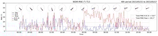 Wind direction MAE with K-B 1 h filter and RAW in W13 during a 48 h period. Wind direction arrows with observations, K-B 1 h, and RAW are displayed on top every four hours.