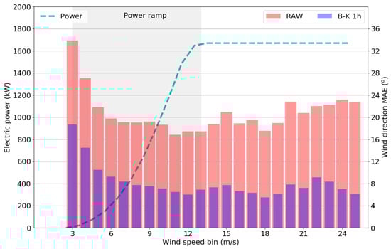ECOTECNIA 74 wind power curve (density = 1.112 kg/m, height = 975 m, temperature = 9 C), cyan line. Each bar of the figure represents the wind direction MAE associated with wind speed bins with a bandwidth of 1 m/s both for RAW (red) and K-B 1 h (blue).
