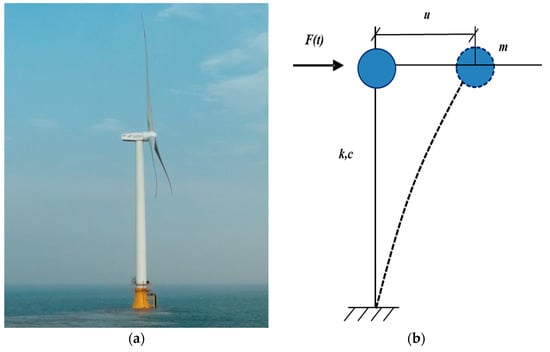 where m, c, and k are, respectively, the mass, damping, and stiffness of the OWT structure, F(t) is the horizontal stochastic wind excitation, u represents the displacement of the wind turbine, and and denote the velocity and acceleration, respectively.