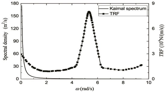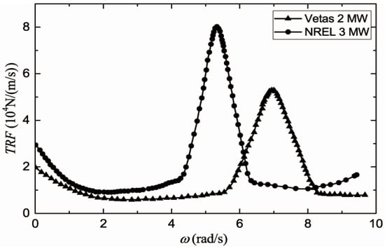 where is the horizontal stochastic wind excitation spectrum and TRF(ω) represents the transfer function of the turbulence wind spectrum to the load spectrum of the top of the tower. For example, the transfer function of the NREL 3 MW wind turbine [41] could be established by scaling the wind transfer function of the Vestas 2 MW wind turbine [42], as shown in Figure 2.