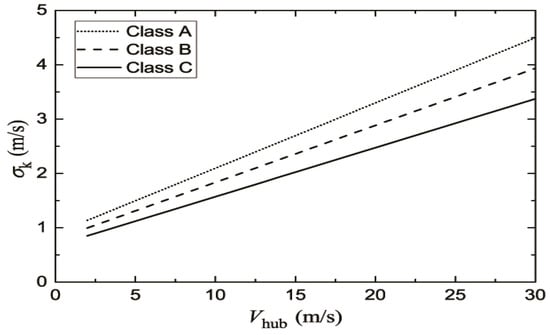 where is the frequency in Hertz, is the single-sided velocity component spectrum, is the deviation of the wind speed component, Vhub is the 10 min horizontal mean wind speed at the hub speed in m/s, and Lk is the velocity component integral scale parameter. Turbulence intensity I is defined as the ratio σk/Vhub. The categories for higher, medium, and lower turbulence denoted by Class A, B, and C are shown in Figure 6, respectively.