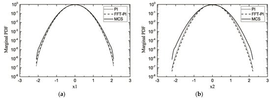 When the initial PDF at was known, the transient evolution of the PDF of X(t) could be calculated by the iterative algorithm, so the PDF of the system response could be calculated at any time t by repeating this procedure. The initial PDF can be chosen as a Gaussian distribution with the mean and variance extracted by the MCS. The cubic B-spline technique was then applied to interpolation such that the required value could be calculated [23]. A general summary of the PI procedure can be found in Reference [20].