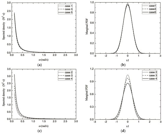 In this section, the effects of the horizontal mean wind speed and the turbulence standard deviation on the results extracted from the FFT-based PI method were investigated. Firstly, the effect of horizontal mean wind speed Vhub was studied by introducing three different mean wind speeds with a turbulence intensity fixed to 2.88. Three different horizontal mean wind speeds of 16 m/s, 20 m/s, and 24 m/s were compared in terms of PDFs of displacement (x1) under stochastic wind excitation, which were respectively considered Case 1, Case 3, and Case 5 in Table 5. The corresponding relative wind excitation spectra for Case 1, Case 3, and Case 5 and the marginal PDF of displacement are displayed in Figure 11a,b, respectively. It is described in Figure 11a that the spectral density from the high mean wind speed was higher than that obtained from the low one, while Figure 11b shows that the marginal PDF from the high mean wind was wider than that calculated from the low one, even though the differences were quite small in these two figures. Thus, it is demonstrated that the horizontal mean wind speed had little influence on the spectral density of wind excitation and the PDFs of responses.