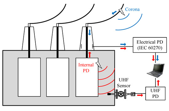 Propagation of ultra-high frequency (UHF) signals, and measurement methods of partial discharge (PD) at a power transformer for both, internal PD (red) and external PD (blue) [12].