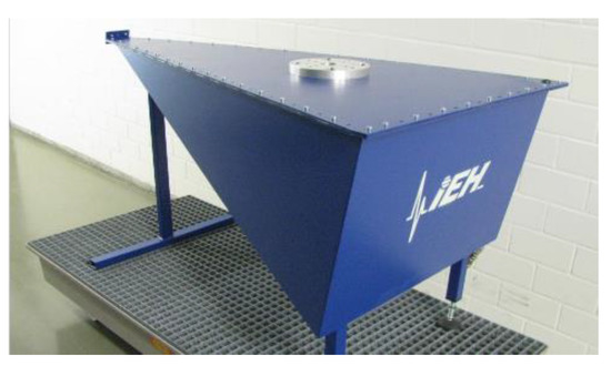 The AF of UHF sensors has been determined within an air-filled transverse Electromagnetic (TEM) cell in previous investigations using a frequency range up to fmax = 950 MHz [3]. Because of the difference in permittivity (εr,air = 1, εr,oil ≈ 2,2), the AF of air measurements does not apply to transformer oil. Its frequency range needs to be recalculated (shifted) to meet the signal propagation speeds of oil. Note: Different oils may have different relative permittivities. The entire bandwidth of UHF sensors cannot be evaluated using only TEM cells. Hence, the correct AF evaluation requires an oil-filled measurement setup [28], which operates in the entirely used UHF frequency range or the usage of an air-filled gigahertz-TEM (GTEM) cell with factor times higher frequency range and subsequent conversion [29] to in-oil measurements. As a result, this contribution uses an oil-filled gigahertz transverse electromagnetic setup (GTEM cell) for K2 evaluation. An appropriate, specially designed oil-filled GTEM cell [12,28], as shown in Figure 4, is used to obtain the AF from the UHF antennas considered for the following calibration test. Note: As the real part of the relative permittivity is not temperature dependent [30], for AF(f) no oil temperature correction is needed.