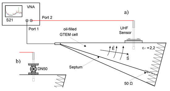 Using scattering parameter (S21) measurements (transmission factor) for antenna factor, AF, determination [26]. (a) UHF sensor installed into the cell (direct mount). (b) UHF sensor mounted using an additional DN50 standard oil valve.