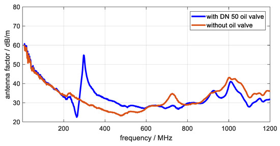 The used UHF sensor provides the best (meaning highest) sensitivity in the frequency range of 200 MHz up to 900 MHz (400 MHz to 900 MHz, respectively, with drain valve), where their AF is lowest. As Figure 6 illustrates, the oil valves have a noticeable influence on sensor’s AF. The valve’s influence peaks at approx. 300 MHz, see blue plot. Comparison of AF(f) and heff(f) measurements of commercially available UHF sensors show similar behavior for most sensors in this commonly used frequency range. As PD excitation is considered broadband, the measurable signal frequencies are mainly dependent on the path inside the device under test [31] and the frequency behavior of the measurement system itself (mainly the AF in this case).
