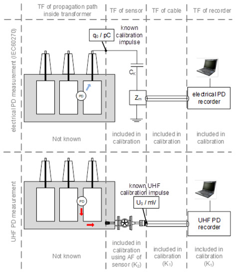 The UHF method is based on the measurement of electromagnetic waves radiated by PD. At first, UHF measurements were used for gas insulated switchgears (GIS) [8]. In GIS, UHF PD measurement is well established, and still evolving, e.g., for high voltage DC (HVDC) GIS [9,10]. When applied on transformers, the UHF method requires antennas inside the tank. Hence, Cigré recommends DN50 valves or dielectric windows for the fitting of UHF probes in technical brochure 343 [11]. The generalized propagation paths of both PD measurement methods are shown in Figure 1.