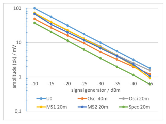 All devices are equipped with an RG 214 coaxial cable of 20 m length. Only the “DSO 40 m” measurement is measured with the same cable type, but of 40 m length. The results are shown in Figure 11.
