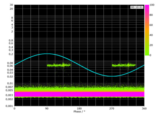 Inside dimensions of the transformer tank are 1720 mm length, 760 mm width, and 1550 mm height, respectively. On the tank wall, there are two DN50 and two DN80 gate valves. In Figure 13 the installed drain valve sensor no 1 with K2 = 25.8 1/m is shown. For the measurements, a second UHF sensor is used with the signal generator to get a stable impulse, which is identical for all measurement devices, see Figure 14. In Figure 15, a phase resolved partial discharge (PRPD) pattern of MS1 exemplarily shows the stable impulse of the excitation using the signal generator in this laboratory setup.
