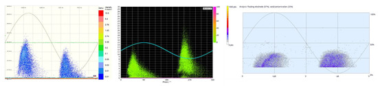 Figure 16 shows the challenge, to identify a measurement reading for comparison by manually evaluating UHF PRPD values. The screenshots show the PRPDs from different measuring systems, which are not calibrated, representing the variety of different visualization approaches and the reason, why UHF PD measurements have been regarded as not comparable in the past. The various visualizations of PRPDs consist of: