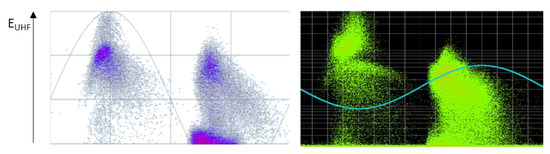 After calibration and applying a comparable plotting setup, these PRPDs should look the same and give the same EUHF reading on the y-axis. e.g., for the two linear scaled PRPDs, phase shifts are corrected and their y-axes are rescaled (which can be considered as applying the proposed UHF calibration procedure). Figure 17 shows the result, which yields high comparability.