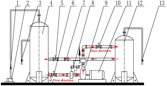 Schematic of the experimental test rig. (1, 3, 13) Ball valve; (2) vacuum pump; (4) pressure tank; (5, 10) butterfly valve; (6) gate valve; (7) turbine flowmeter; (8) pressure transmitter; (9) test pump; (11) electromotor; (12) buffer tank.