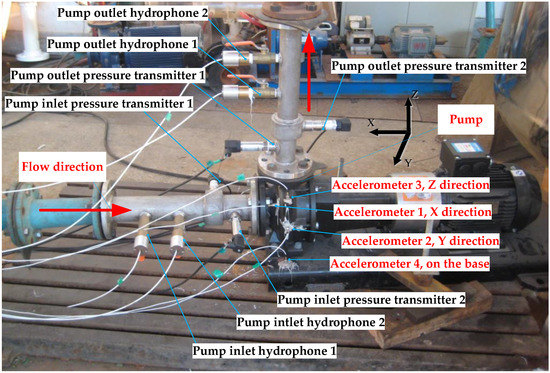 In Figure 3, a closed hydraulic test rig was designed and built up. Four piezoelectric accelerometers were installed in different positions in the test rig to collect the vibration signals induced by the flow instabilities in the pump at different flow rates. The vibration signals in X, Y, and Z direction were measured by accelerometer 1, 2, and 3, respectively. At the same time, the vibration on the base was tested by accelerometer 4. The type of the piezoelectric accelerometers was MA352A60, which has a wide testing range (5 Hz to 70 kHz). In the current experiment, the sampling frequency of the vibration signals was set as 20,000 Hz. The stereogram of the test rig and the installing positions of the apparatuses are depicted in Figure 4.