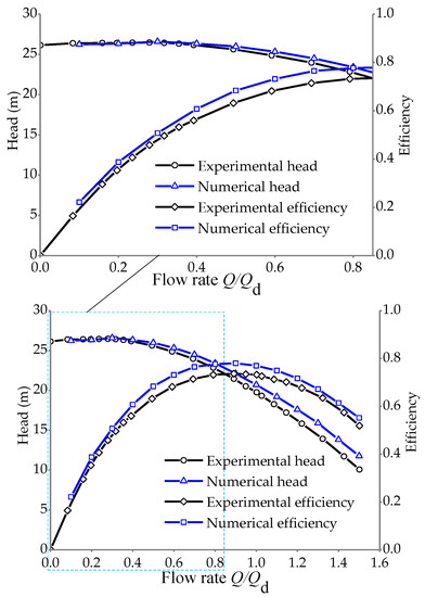 The performance curves of the centrifugal pump are shown in Figure 5. A reasonable consistency between the numerical results and the experimental results could be found, with the flow rate increasing from 0 to 1.5 Qd. The relative error between the numerical and experimental results was within 5% in a wide flow range. Especially, a good agreement between the calculation and measurement of the pump performance was found at part load conditions. Therefore, the results of the simulation can be verified by the experiment.