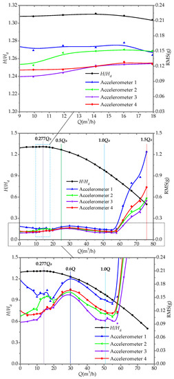 The relationships between the root mean square (RMS) of the vibration tested at different locations in the system, the head of the pump, and the variation of the flow rate were established, depicted in Figure 6. The vibration was measured at four different points, shown in Figure 4. The vibration intensity of each measuring point showed almost the same trend as the flow rate changes. It was illustrated that the RMS value of the vibration signals at all the testing points retained a relatively small fluctuation when the flow rate increased from 0 to around 1.15 Qd (58 m3/h). All the vibration signals began to increase significantly while the flow rate exceeded about 1.22 Qd (62 m3/h), which indicates the occurrence of cavitation. The intensity of vibration measured at all the testing points dramatically intensified with the further increase of Q, because of the development of cavitation in the centrifugal pump. This occurrence and development of cavitation will be confirmed by the following power spectral density (PSD) analysis and the numerical simulation. It is obvious that the cavitation in the pump has a great influence on the intensification of the vibration.