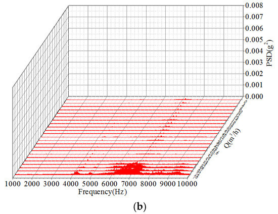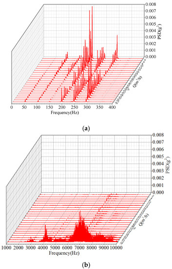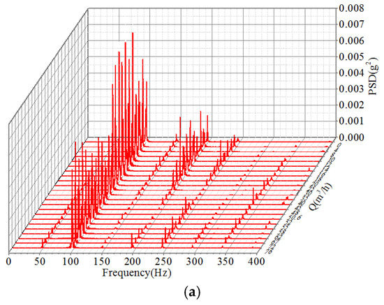In order to make a comprehensive analysis of the vibration signals mentioned above, the power spectral density (PSD) of the testing vibration was investigated. The relationships between the PSD of vibration obtained from the four different testing points and the flow rates of the centrifugal pump were established, shown in Figure 7, Figure 8, Figure 9 and Figure 10.