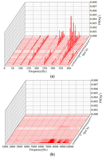 Power spectral density (PSD) of the vibration measured by accelerometer 1 under different flow rates. (a) 0–400 Hz, (b) 1–10 kHz.
