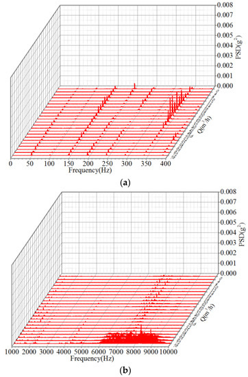 Apparent interference signals distributed from 0 to 400 Hz can be found, except for measuring point 4, illustrated in Figure 7a, Figure 8a, Figure 9a and Figure 10a. It is regarded that the spectrum component on the frequency range was induced by the interaction between static volute tongue and rotating impeller blades. Testing point 4 was located on the platform far away from the volute and impeller, so the vibration signals associated with the shaft frequency (f0) were not obvious.