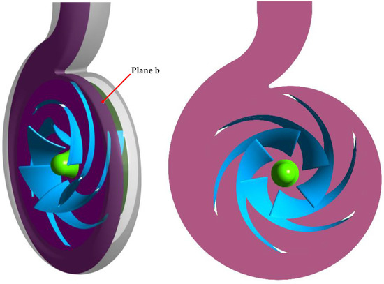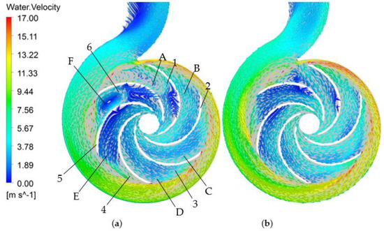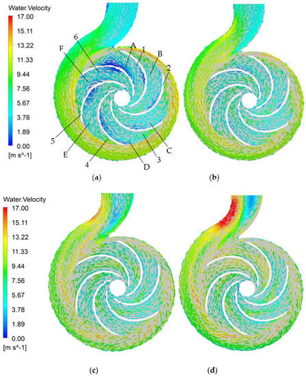 In this paper, only the steady calculation was conducted to predict the flow state at various flow rates. The flow instabilities in the pump intensified in general while the centrifugal pump operated under the off-design conditions. In order to investigate the internal flow characteristics, the absolute velocity distributions of water in axial plane b under different flow rates are shown in Figure 12. The position of axial plane b is illustrated in Figure 11.