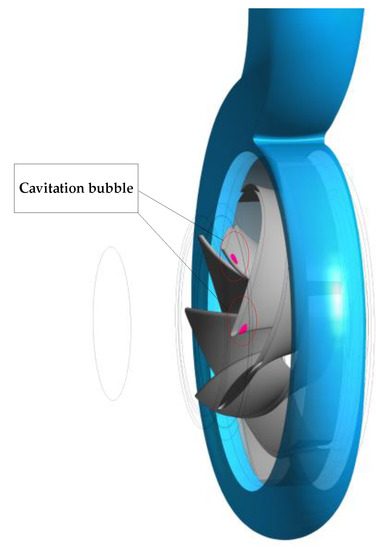 It is clear that the inner flow uniformity, instead of obvious flow instabilities, can be found when the flow rates increase from 0.8 Qd to 1.0 Qd, depicted in Figure 12b,c. The water velocity distribution in the impeller is still relatively uniform and symmetric when the flow rate is 1.2 Qd, illustrated in Figure 12d. The local water velocity at the corner of the volute outlet increases dramatically, however, due to the great changes in the direction of flow velocity, which can lead to the increase of the local hydraulic loss. Meanwhile, the cavitation bubbles are observed at the pressure side of two blades’ leading edges, depicted in Figure 13. The bubbles are illustrated by the isosurfaces for a 1% vapor volume fraction. The proof of the occurrence of cavitation discussed in the previous section is now observed from the numerical simulation results, which strongly demonstrates the accuracy between the experimental research and numerical calculation, again.